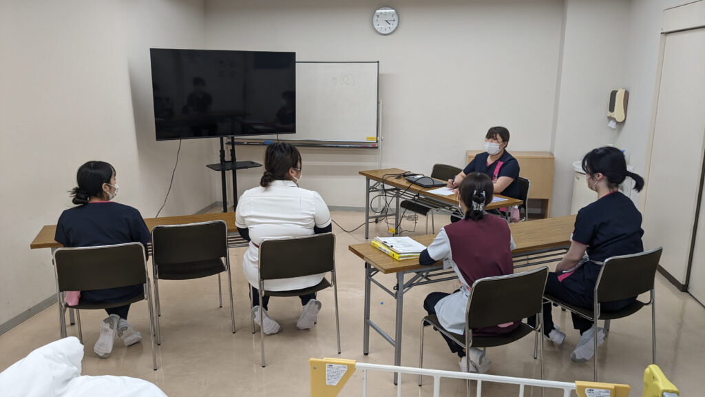 当院看護部の院内研修会は、一方的に講義することはできるだけ避けて、参加者が一緒に作り上げる研修会を心がけています。講義形式であれば参加者と対話しながら進めたり、又グループワークやパネルフォーラム、ロールプレーイングなどを取り入れています。少人数の研修会はできる限り勤務時間内に組み込むようにしています。